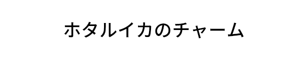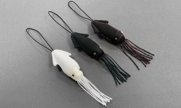 見る角度により光り方が変化するよう、生地の型抜きの段階で生地の方向性にこだわっているホタルイカのチャーム。海の中で光り輝くホタルイカを再現しています。